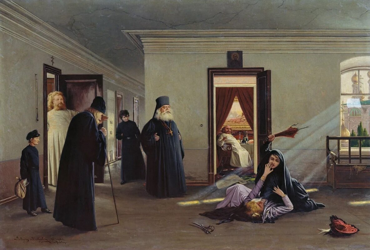 Я читала разные размышления по поводу этой картины. Некоторые люди бурно протестуют против того, что священнослужитель мог вызвать ревность монахини. Но, тем не менее, именно это и изобразил Яковлев.