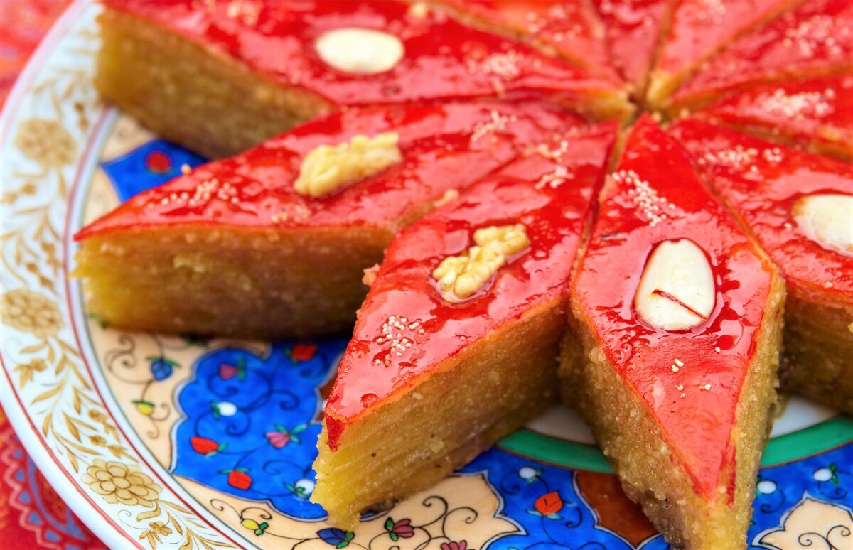 слоями и на последний слой). Порежьте пахлаву так, чтобы получились ромбики. Заварите несколько лепестков шафрана стаканом