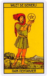 Полное описание колоды на сайте: На аркане юноша бережно держит монету. Паж Пентаклей аккуратный и педантичный. Он очень внимателен к деталям. Ответственный и для своих лет слишком серьезный. Обычно он красиво движется, хорошо владеет своим телом и умеет многое делать руками. Он хозяйственный и практичный. Использует любую возможность перенять чужой опыт. В нем нет гордыни и заносчивости. На уровне Пажа Пентаклей происходит первое знакомство с материальным миром. Человек еще не способен что-то производить, но уже учится ценить ресурсы и беречь их. Аккуратно и грамотно ими пользоваться. Он с благодарностью принимает рекомендации и чужой опыт. Глубоко внутри личности сидит мечта сотворить самому что-то значительное. Но время действовать еще не пришло. На этом этапе человек увлеченно пробует свои силы на текущем материале. То есть он просто аккуратно ведет свое хозяйство, что-то мастерит, чинит, имеет хобби в виде поделок своими руками. У него дома ощущение присутствия дельного хозяина