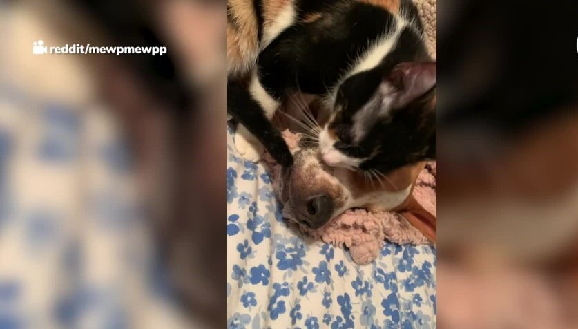 Использован материал: Watch: The way this tortoiseshell cat treats her doggy brother is unbelievable. Источник: wamiz.co.uk. Фото и видео: mewpmewpp – Reddit (социальные сети).