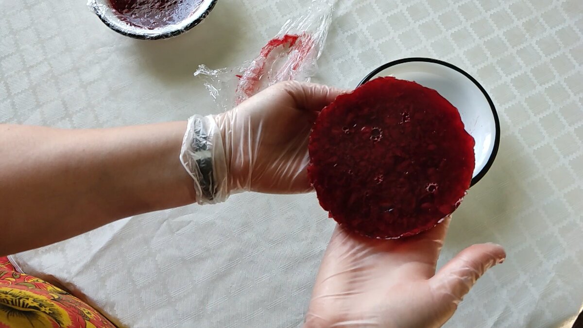 По истечению времени достаем компоте, аккуратно вместе с пленкой вытаскиваем из тарелки и плёночку снимаем с начинки.