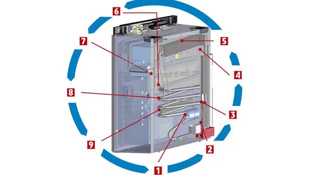 Что делать, если охлаждающая способность абсорбирующего устройства оставляет желать лучшего? Часто стоит взглянуть на инструкцию по эксплуатации. Там сказано, что - как уже было показано - это имеет место при работе от 12 вольт, но также и при работе на газе, если вы находитесь на высоте более 1000 метров. Контур абсорбера работает менее эффективно, если холодильник слишком наклонен. Однако наклон в 2,5 градуса допустим.