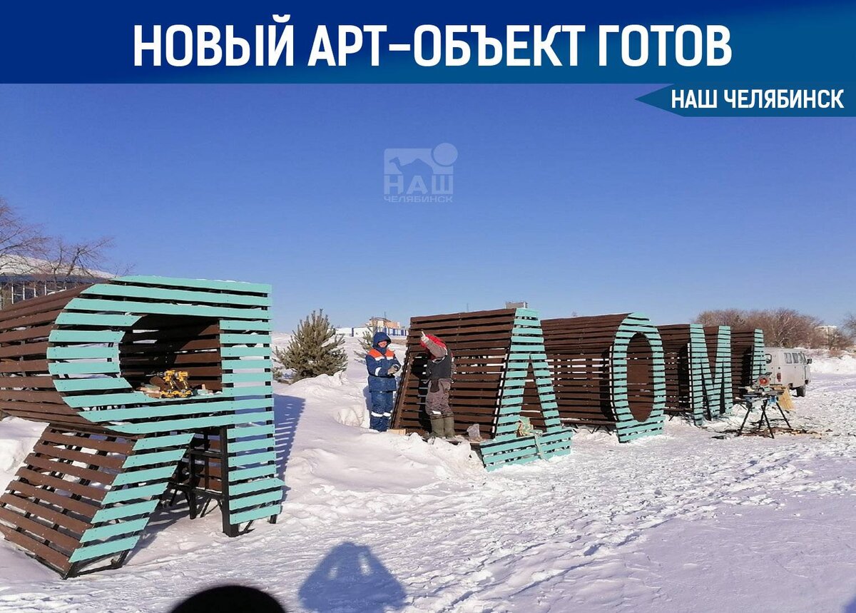 В Челябинске завершают монтаж арт-объекта “Я дома”. Композиция в виде короткой фразы находится на набережной Миасса за Торговым центром. Как было презентовано ранее, по задумке объект должен был выполнять роль лавочки - скамейки планировали установить по бокам букв. Но последние несколько месяцев на месте объекта стоял только голый каркас железных букв, и казалось, что авторы забыли о своем проекте. К счастью, во время потепления монтаж арт-объекта возобновили. Торжественное открытие объекта планируют провести ближе апрелю, хотя подрядчики планируют сдать его уже на этой неделе. По материалам hornews. com
