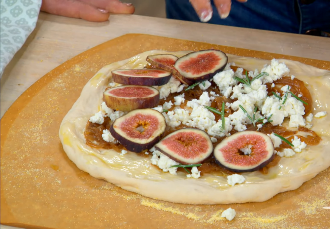 Чтобы приготовить пиццу на гриле: нагрейте газовый гриль на сильном огне и смажьте решетку маслом. Двумя руками осторожно переложить тесто на горячий гриль. Закройте гриль и готовьте от 1 до 3 минут, пока не появятся пятна от гриля и не всплывет тесто. Используя щипцы, переложите тесто на посыпанную мукой цедру или противень приготовленной стороной вверх. Сверху выложите варенье из инжира, лук и сыр на приготовленную сторону и верните на гриль сырой стороной вниз. Жарьте на гриле, пока другая сторона не прожарится и сыр не расплавится, от 1 до 3 минут. Сверху выложите прошутто и рукколу, как указано в рецепте.