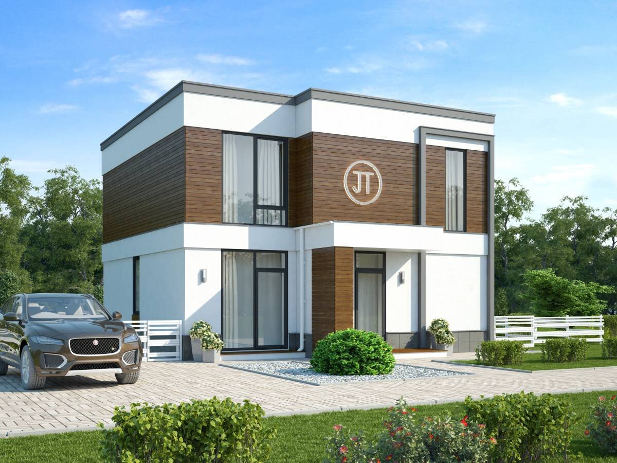 Актуальная минималистичная архитектура дома отлично подходит для массовой застройки коттеджных посёлков. Дом экономичный, как в возведении, так и в обслуживании.