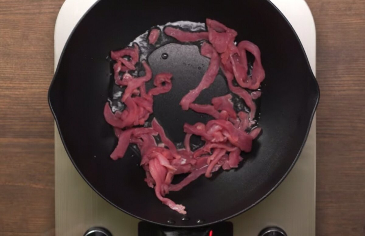 Приступим к готовке. В сковороду добавляем 50 мл. растительного масла, обжариваем свиную вырезку на сильном огне 1-2 минуты, при этом помешиваем (часто, главное не пережарить). Обжаривать лучше в несколько порций, чтобы мясо обжарилось лучше. После обжарки мясо перекладываем в посуду и убираем в сторонку.
