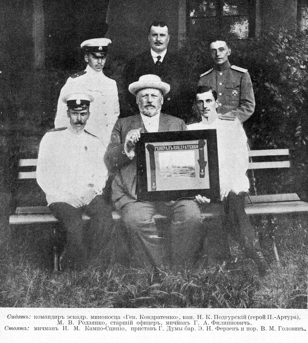 Во время поездки членов Государственной Думы в Ревель для встречи английских моряков они, между прочим. посетили эскадренный миноносец «Генерал Кондратенко», носящий имя знаменитаго героя обороны Порт-Артура. Команда миноносца, тронутая вниманием членов Г. Думы, в знак памяти об их посещении поднесла председателю Г. Думы М. В. Родзянко снимок с миноносца. Специальная миссия во главе с командиром