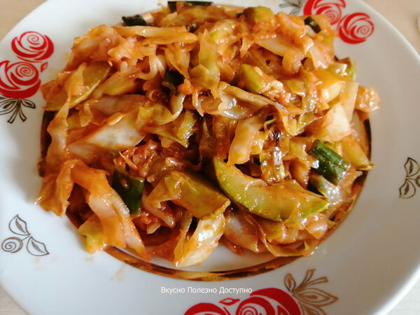 - Затем добавить нашинкованную капусту и томатную пасту.