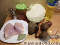 Продукты (на 4 порции) Курица Капуста - 300 г Картофель - 3 шт. Лук репчатый - 1 шт. Морковь - 1 шт. Свекла - 1 шт. Лавровый лист - 2 шт. Бульон куриный - 3 л Масло подсолнечное - 2 ст. ложки Томатная паста (или кетчуп) - 2 ст. ложки Соль - по вкусу