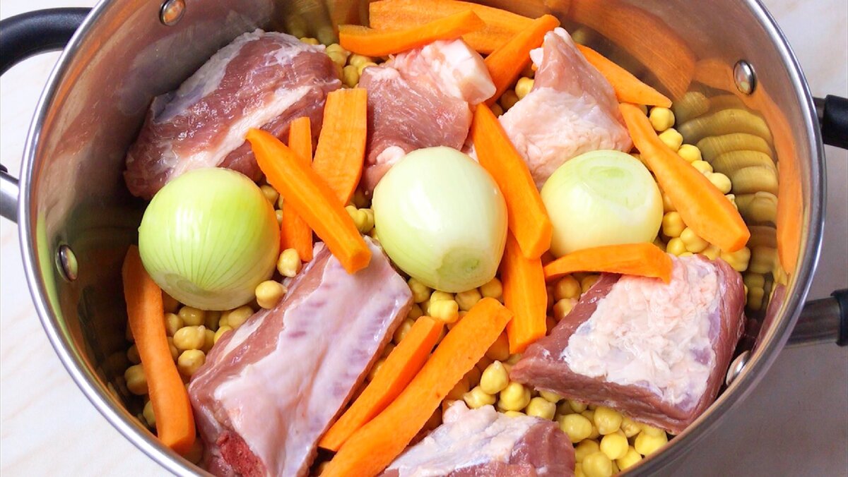 Нут хорошо набухает , я его промываю и добавляю мясо , лук и морковь .