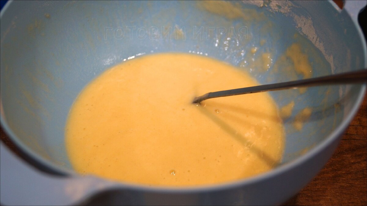 2. Добавляем разрыхлитель и просеянную муку. Перемешиваем венчиком до полной однородности. Добавляем води и снова перемешиваем. Тесто тягучее и однородное.