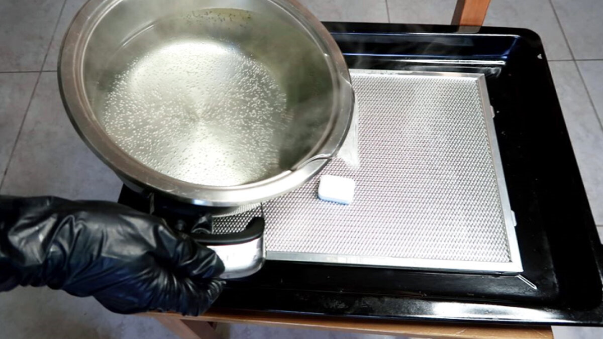 Фильтры вытяжки отмыть достаточно сложно, но есть очень простой способ - при помощи кипятка и 1 таблетки для ПМ. Тут делать ничего даже не нужно, берем поднос или какую-то посуду, кладем фильтр, таблетку и заливаем кипятком, оставляем на 10 минут и все готово.