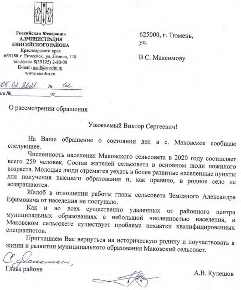 В течение месяца в редакцию и автору (мои почтовые реквизиты, несомненно, имеются в администрации Енисейского района) так и не поступил ответ на поднятые вопросы. Поэтому 9 января 2021 года я вынужден был обратиться к вам с запросом о вашем видении состояния дел Маковском сельском поселении.