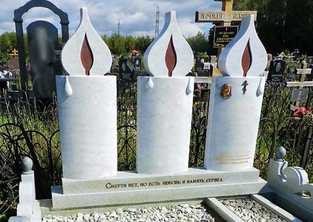 Свечи могут быть разными по форме и размеру. Например, маленькая свечка (тумба, постамент) и большое пламя (фигурная стела) или большая свеча (прямая стела) и маленький огонёк на вершине. За 20 лет работы мы создали большое количество разнообразных "Свечек" для могилы.