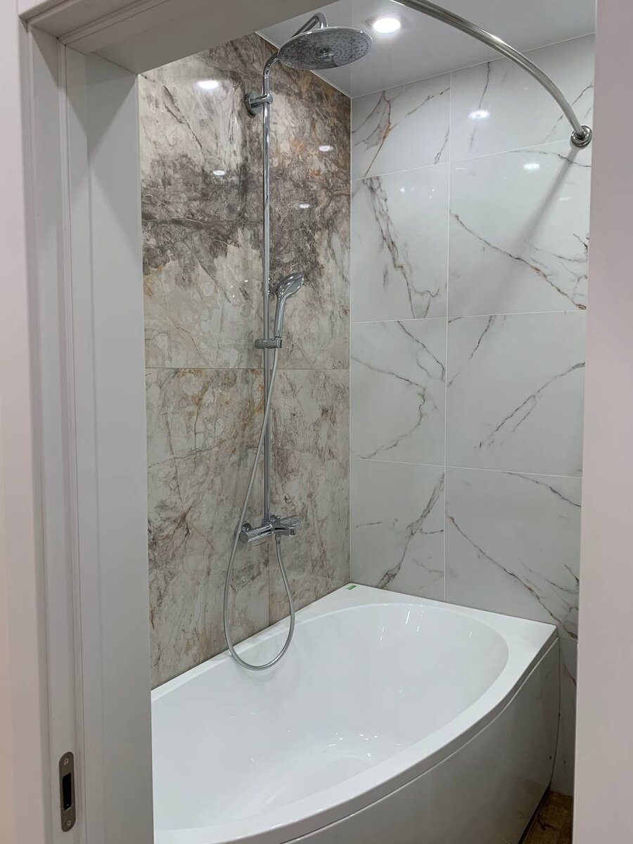 В ванной и туалете смонтировали медные трубы, установили инсталляцию, гигиенический душ. Смонтировали крупноформатный керамогранит 60х120 и 60х60. Установили санфаянс.