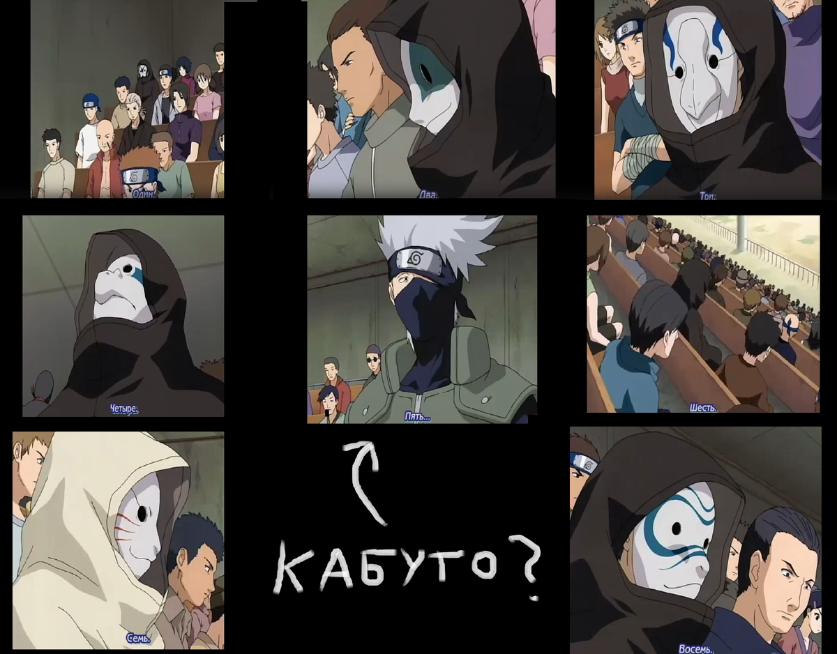 Обратите внимание, когда счёт доходит до ПЯТИ(центральный кадр), нам не показывают лицо агента в маске(ну или маску на лице агента), а просто видим Какаши, который смотрит в какую-то сторону. Предположительно, в этот момент он смотрел на.... замаскированного Кабуто. И да, скажете вы, тут есть некая не состыковка, но сейчас я постепенно опишу всю мысль объёмнее, и приду к сути.
