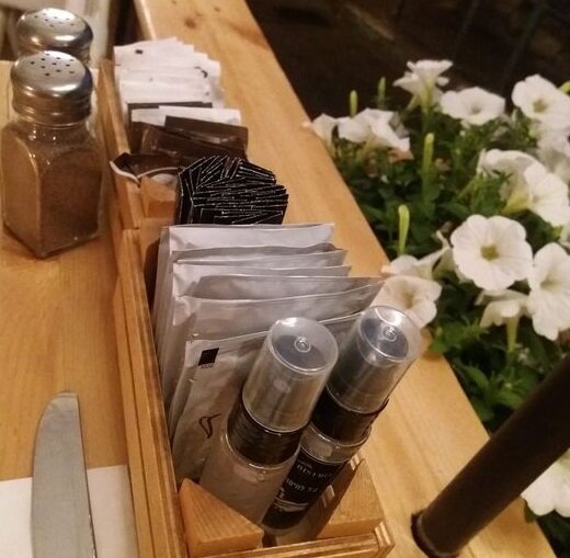 Во-первых, все столики теперь обеспечены таким набором: соль-перец, сахар-сукразит, санитайзеры-влажные салфетки.