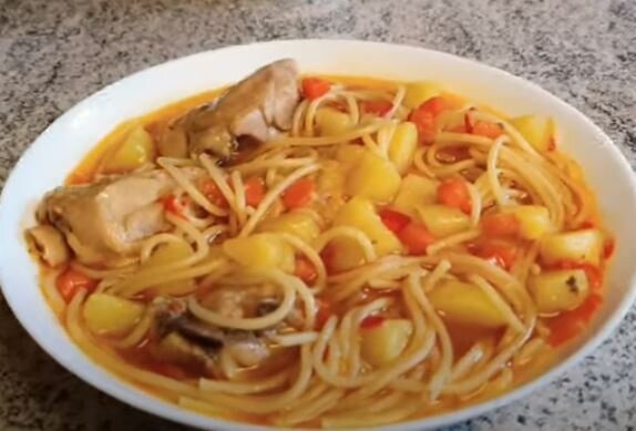 5.Пока обжаривается филе, кипятим воду в кастрюле, добавляем щепотку соли и отвариваем лапшу. По готовности лапши откидываем ее на дуршлак и возвращаем обратно в кастрюлю.