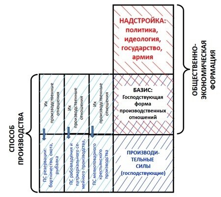 Категорию «общественно-экономическая формация » Маркс обосновал для обозначения конкретно-исторического единства ГОСПОДСТВУЮЩЕГО вида производственных отношений (базис) и соответствующей этому базису надстройки , т.е. политических и идеологических организаций, учреждений и отношений, прежде всего, господствующего класса, не игнорируя, разумеется, наличие идей, отношений и организаций эксплуатируемых классов и прослоек.