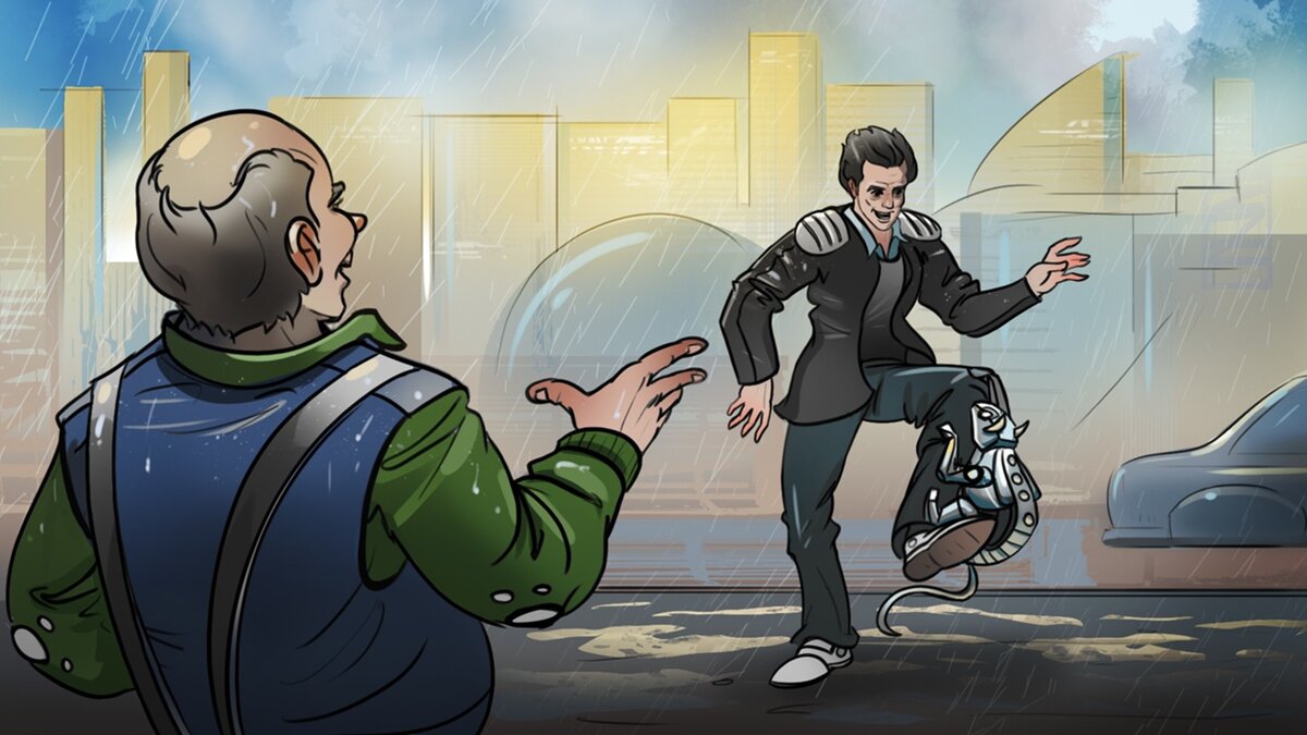 Они дошли до аэромобиля и запрыгнули внутрь. Машина плавно поднялась в воздух и поплыла вдоль небоскребов, разрезая стену дождя.