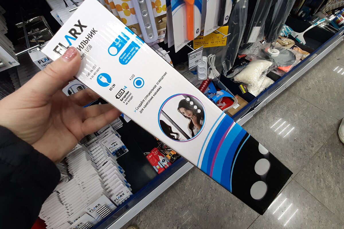 Светильник состоит из четырех лампочек. Есть липучки и его можно прикрепить на зеркало например.