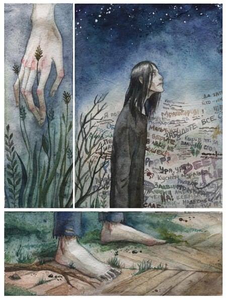 Песня не даётся даром, за неё надо заплатить своей кровью, что Слепой и делает, добровольно дав напиться Сааре. Через эту песню он входит в сеть Арахны, которая должна «поймать» всех и объединить. И у него получается. Не просто входит – становится ей. Он – главный двигатель внутренних процессов, происходящих в Доме. Без него не было бы никакого Исхода, может ушла бы пара Ходоков, как в прошлом выпуске, а остальные разбрелись бы по Наружности влачить жалкое существование калек. Кстати, и Чёрного, который организовал народ в наружную общину, вожаком поставил тот же Слепой. Но он делает всё как-то так незаметно и не пафосно, что даже продвинутый читатель не сразу в полной мере осознаёт значение его поступков. И если детские образы других обитателей Дома забываются, слезают с них как уже ненужные шкуры, то все ипостаси развития Слепого как разного размера матрёшки постоянно остаются в нём, отлично осознаваемые и чётко рассортированные. И мы ни на секунду не забываем о мальчике, которого привёл за руку Лось.