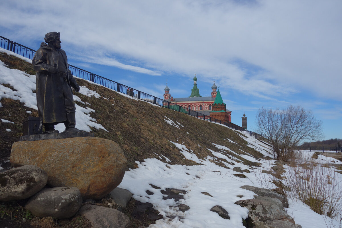 Этот крайне реалистичный персонаж в шапке-ушанке, с рыбацким ящиком у ног, появился на берегу Волхова года три назад. Забавный дедок стоит среди камней неподалеку от новой пристани у Никольского мужского монастыря. Летом туда приходят круизные корабли, поэтому он первым встречает прибывающих туристов.