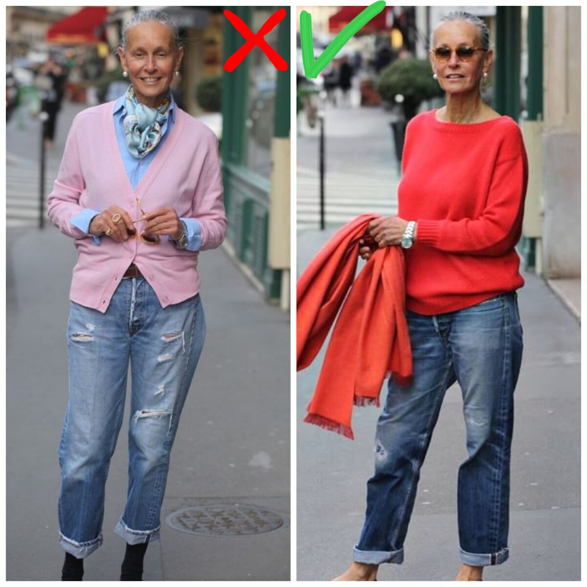 Используйте в одежде сложные цвета. Например, если любите серый, тогда носите сложно-серый или интересный синий. Такие цвета хорошо сочетаются с возрастной внешностью и делают её более благородной.