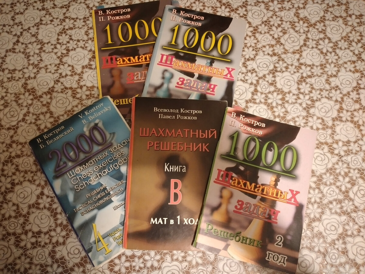 1. Серия В. Костров, Б. Белявский «2000 шахматных задач». Эта серия из четырёх книг появилась у меня в старших классах, когда я усиленно занималась шахматами. Тогда я ещё не была тренером, участвовала в соревнованиях. Нужны были задачи, чтобы повышать свой уровень игры. В этих книгах материал приводится по разделам: