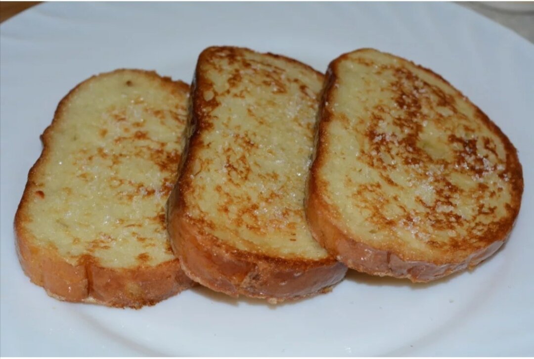 - Берём батон обмакиваем с двух сторон в яйце и кладём на сковороду