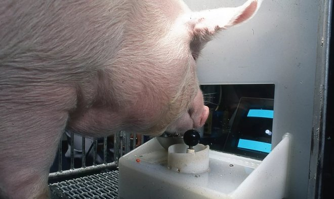 - Группе исследователей из Университета Пердью (США) удалось доказать способность свиней к освоению некоторых навыков компьютерных игр – в частности, они могут манипулировать игровым джойстиком, используя свою морду. При этом животные еще и контролируют происходящее на дисплее. В случае успешного решения поставленной задачи свиньи получают вознаграждение.