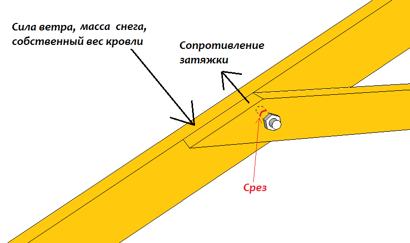 Стропильная нога стремится прогнуться под различными нагрузками, а затяжка воспринимает на себя это напряжение и противостоит ему, таким образом нагель работает на срез в той плоскости, где обе детали стремятся сместиться друг относительно друга.