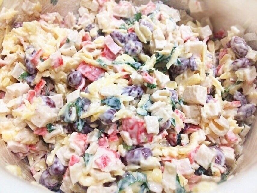 Нарезать крабовые палочки, к ним добавить фасоль, перед этим слив сок, натереть сыр на крупной терке. Добавьте майонез, посолить и поперчите по вкусу. Вместо майонеза можно использовать натуральный йогурт. Все перемешать.
