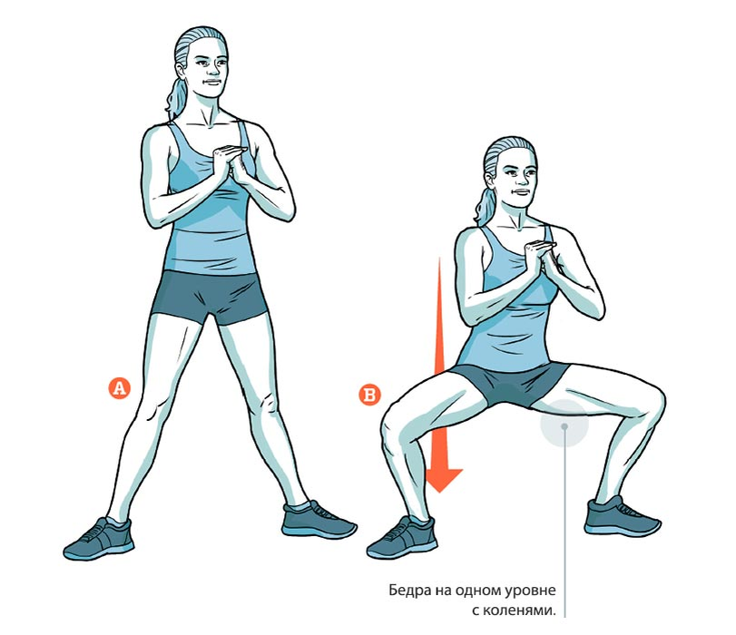 - На выдохе медленно присядьте так, чтобы между голенями и бедрами образовался прямой угол.