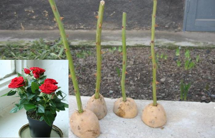Существует незамысловатый способ выращивания роз с помощью картошки. Для этого подготовленные по известному уже вам алгоритму черенки воткните в клубень картошки. В горшок поместите слой дренажных камней, слой песка и