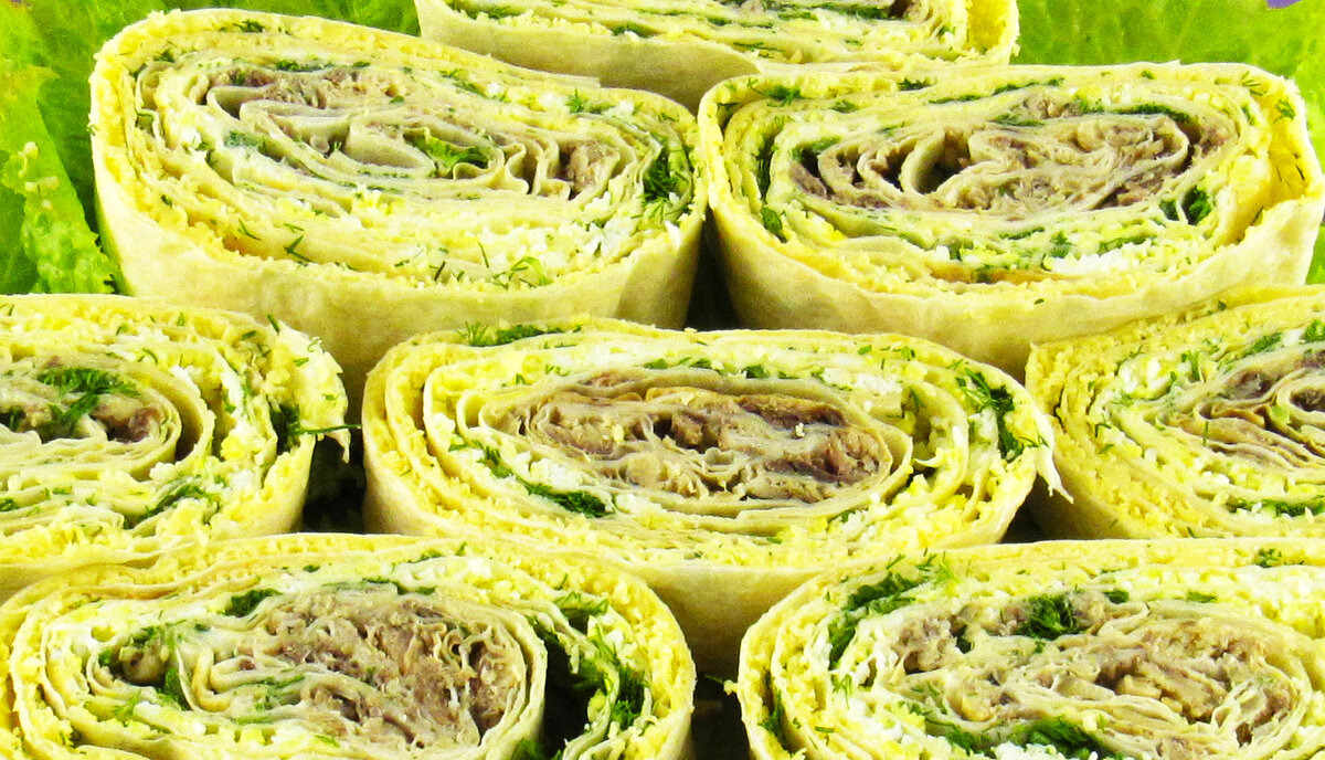 Разложить листы лаваша. Каждый смазываем майонезом. На один - натереть вареные яйца, на другой - сыр на мелкой терке, на третий - выложить помятую вилкой сайру. Сверху каждый лист посыпать зеленью.