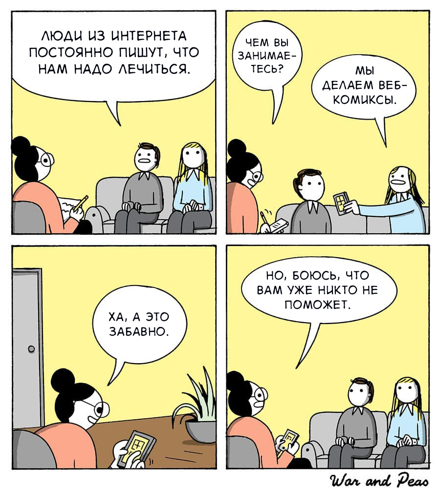 В своих комиксах Элизабет Пич и Джонатан Кунц затрагивают множество тем: героями их четырехпанельных зарисовок могут становиться как самые обычные люди, так и герои многочисленных мифов и сказок. Поэтому сюжет о ссоре у барной стойки вполне может соседствовать с историей о похищении инопланетянами. Одно можно сказать точно - за годы существования War and Peas юмор его авторов лишь отточился, а и без того узнаваемы визуальный стиль стал самой настоящей визитной карточкой проекта. Для этой статьи я перевел несколько понравившихся мне комиксов от дуэта авторов из Саарбрюккена - надеюсь, что эти зарисовки насмешат и вас!