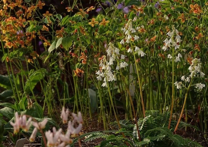 Птеридофиллум вызвал такой шквал реакций! Оказывается, многие не знали о существовании такого забавного растеньица и по просьбам пишу о нем пост. Последние несколько лет я о нем забываю и не дохожу с камерой, а виной всему вот эта рыжая бестия на заднем плане – горянка Epimedium warleyense Orangekönigin. Нарастает она гораздо быстрее медлительного птеридофиллума, и в прошлом году он и вовсе в ней потонул… К своему удивлению, обнаружила осенью, что он жив: поскольку растение – эндемик горных лесов Северной Японии, оно достаточно теневыносливо по природе. А вот фото есть только старые – позапрошлых лет и их качество меня несколько нервирует, ну да ладно.