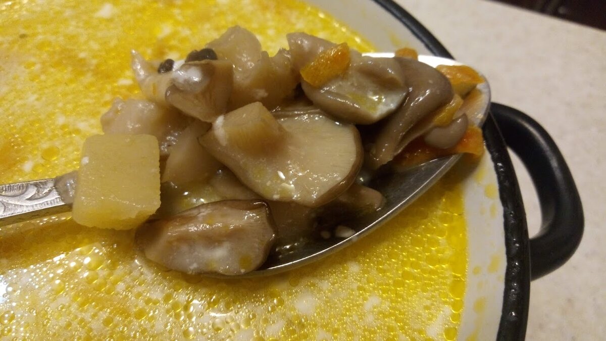 В кипящую воду добавляем грибы со сковороды, отвариваем в течении 30 минут, добавляем картофель. Варим минут 10-15 до готовности картофеля, добавляем поджарку лука с морковью и варим еще 5 минут.
