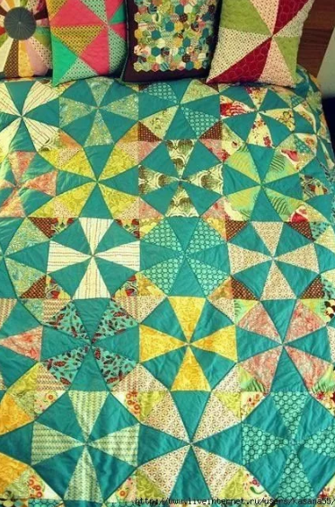 Калейдоскоп - очень эффектный лоскутный блок, который хорошо смотрится в комбинации из цветных и однотонных тканей. Собирается из треугольников, которые в свою очередь могут быть сшиты из полос (см. фото 2). Выглядит наворочено, но на самом деле шьется очень просто. Завтра будет опубликовано видео с подробным мастер-классом по сборке этого блока http://patchtoquilt.ru/board/7-1-0-290 Как его сшить? (мастер-класс)