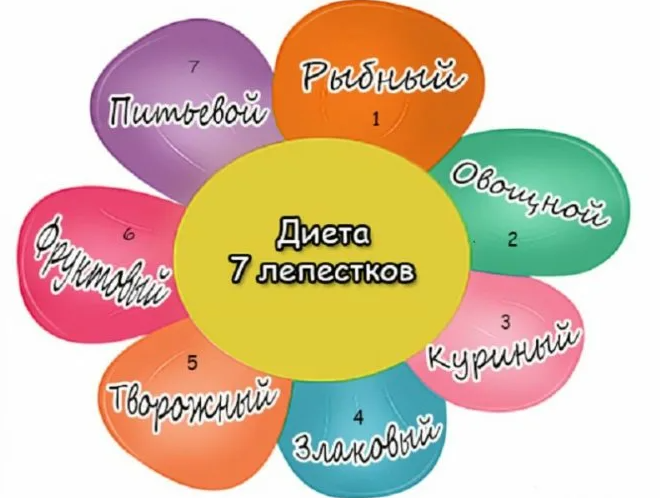Диета 7 лепестков является переработанным вариантом известной диеты Анны Юхансон «6 лепестков». Основой данной диеты является каждодневное чередование белковых и углеводных монодиет. Моно (от слова один) означает, что вы должны питаться только одним продуктом, а в случае лепестковой диеты одним продуктом в течение одного дня.