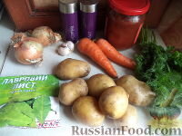 Продукты (на 4 порции) Картофель - 8-10 шт. Морковь средняя - 2 шт. Лук репчатый средний - 2-3 шт. Чеснок - 5 зубчиков Томат-паста - 2 ст. ложки Лавровый лист - 1 шт. Зелень укропа, петрушки или кинзы, измельченная - 2 ст. ложки Соль - 1 ч. ложка (по вкусу)
