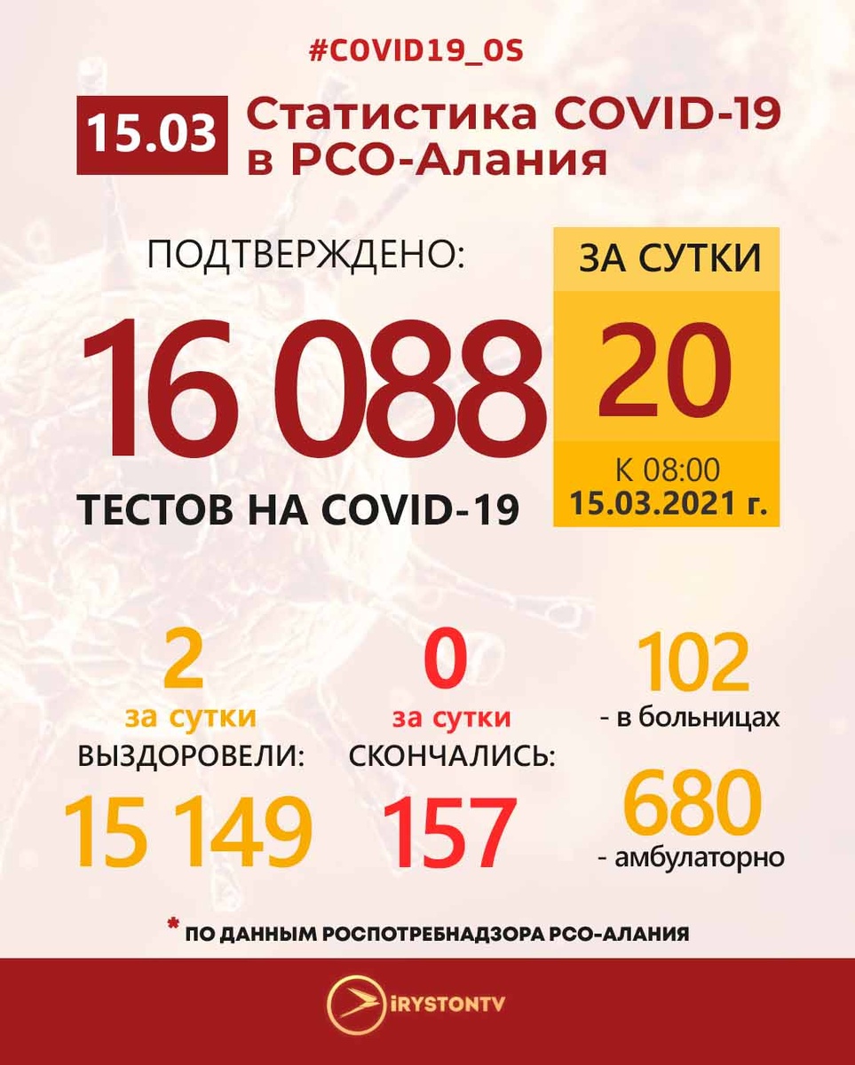 По данным Роспотребнадзора РСО-Алания на 08:00 15 марта 2021 года в Республике Северная Осетия-Алания зарегистрировано 16 088 (+ 20 за сутки) случаев заражения новой коронавирусной инфекцией.