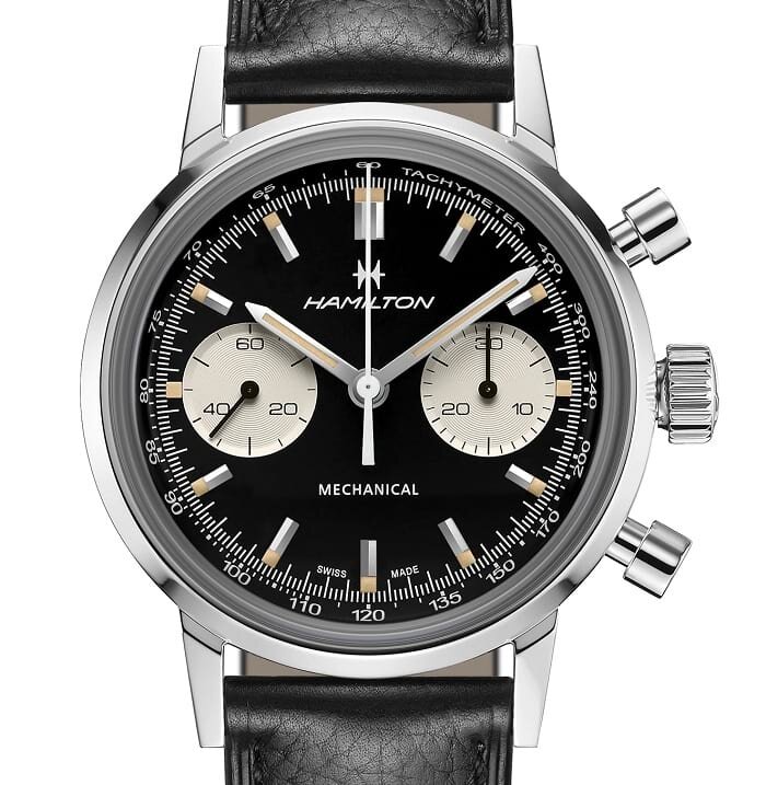 Hamilton вернул в свою линейку механизм-хронограф с ручным заводом. Специально разработанный калибр H-51 стал сердцем нового хронографа в винтажном стиле Hamilton Intra-Matic Chronograph H, который является частью коллекции American Classic. Дизайн модели вдохновлен хронографами Chronograph A и Chronograph B 1968 года, характерной чертой которых был так называемый panda dial (панда циферблат – белый циферблат и черные счетчики) и reverse panda dial (обратный панда циферблат – черный циферблат и белые счетчики). Для Hamilton этот дизайн является наследием бренда и в последние годы мы видели несколько реализаций на эту тему – например, Hamilton Intra-Matic 68 и Hamilton American Classic Intra-Matic Auto Chrono.