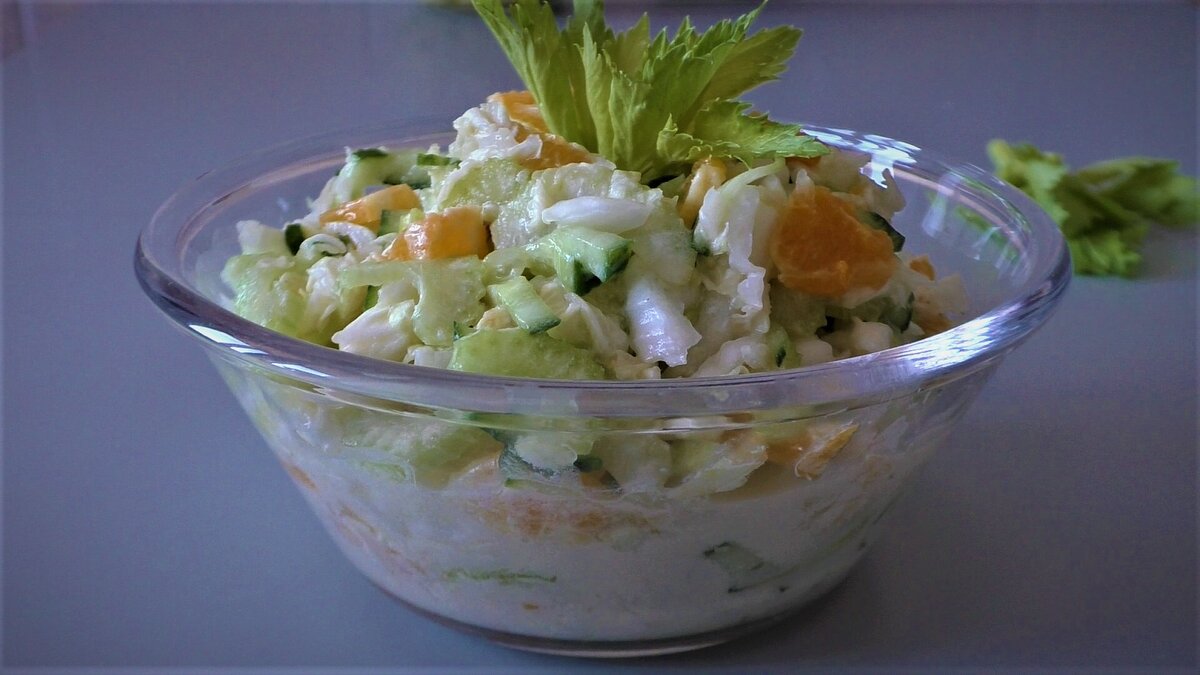 Предлагаю приготовить вместе со мной вот такой салат из пекинской капусты. Благодаря необычному сочетанию продуктов, получается он настолько вкусным, что его хочется есть постоянно. Здесь много вкусных рецептов Давайте готовить Процесс приготовления можно посмотреть в видео ниже + БОНУСНОЕ видео Пекинскую капусту шинкую мелкой соломкой. Немного солю и слегка разминаю, без фанатизма, так она будет более сочной. Выкладываю в салатник. Так же соломкой нарезаю огурцы. Отправляю в салатник. Режу стебель сельдерея. Мандарин очищаю и нарезаю его небольшими дольками, отправляю в салатник. Салат солю, перчу и заправляю непосредственно перед подачей на стол. В качестве заправки я использую чайную ложку майонеза и 1 столовую ложку йогурта без добавок, у меня свой домашний, как я его делаю можно посмотреть здесь. Все хорошо перемешиваю. Выкладываю в порционный салатник и подаю к столу. Вот такой яркий, красивый, как весеннее солнышко салат получился. А какой он вкусный. Попробуйте при