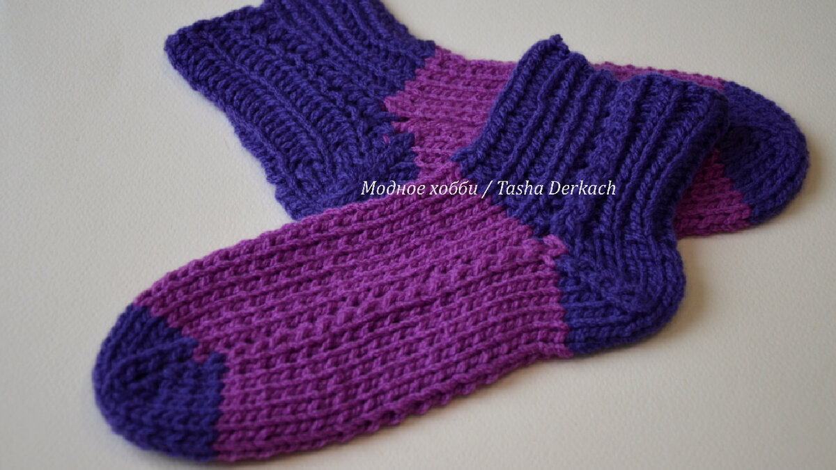 Довязав до резинки, меняем цвет нити и вяжем пятку так же как и мысок.