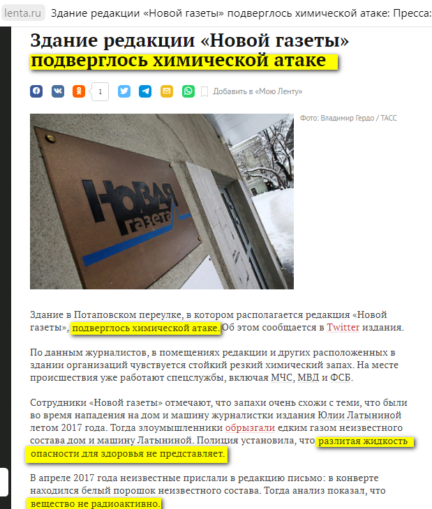 Ведь что мы видим в статье? Заголовок: "Химическая атака". Читаем: распылили вещество, чувствуется запах, таким была атакована одиозная журналистка, вещество безвредно. И?.. В чём новость? Может, это кто-то из сотрудников разбил банку уксуса, может духи разлились, может средство для мытья полов дешёвое использовали... А крику! Химатака!!!