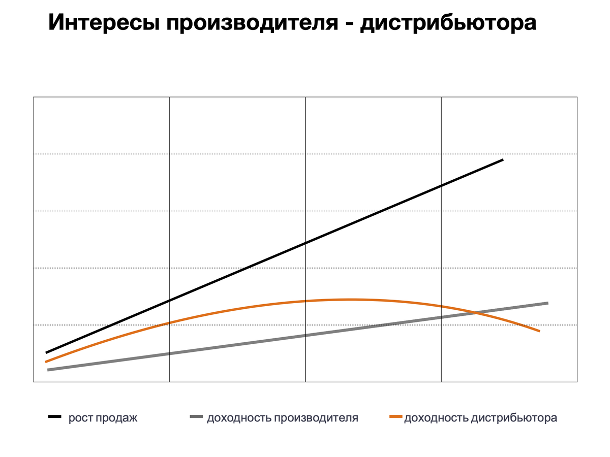 Слайд наглядно демонстрирует условия работы дистрибьюторов: черная линия — рост продаж , серая — доходность производителя , оранжевая — доходность дистрибьютора .Важно, чтобы персонал компании — производителя , а именно те специалисты которые взаимодействуют с дистрибьютором, требуя от дистрибьютора роста продаж, роста товарных запасов, роста покрытия, среднего SKU и далее всех традиционных КРI, понимали, что есть середина.