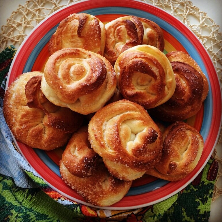 2. Разделите тесто на части, раскатайте каждую, смажьте маслом, присыпьте сахаром и сформируйте сердце: скрутите рулетиком, сложите вдвое, от сгиба по боковой части сделайте разрез на 2/3 длины и разверните. Дайте плюшкам еще подойти.