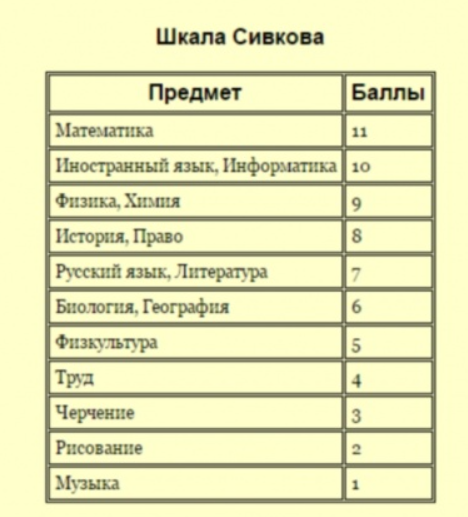 Для правильного и выверенного составления расписания уроков завучи обычно используют шкалу Сивкова, в которой указана трудность предметов в неких условных единицах, вот она: